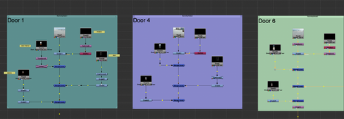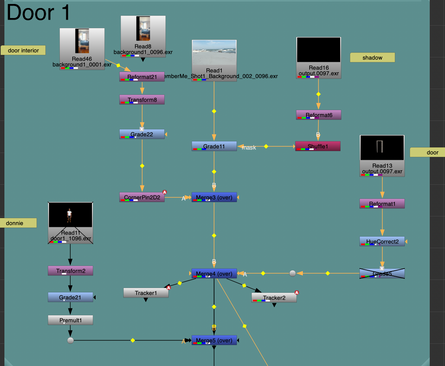 This is what my node graph looks like for the final comps. First photo is for shots 1, 2, and 4 (individual doors). Second photo is for shots 3 and 5 (moving in circle).