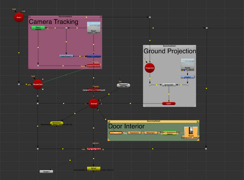 Node graph for the ground projection and final shot comp (That's the set up for all individual door shots. The circle shot is just a much longer version of this) .