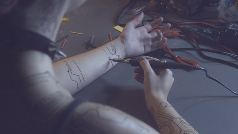 In preparation for tomorrows class / work day, I created a final version of the clean plate and made some alphas in Photoshop. I will use the clean plate to cover up the lines that overlap with the arm model. I plan to use the alphas for the glow and use the edge detect node to get the outer edges. I am thinking this will work better than relying on getting an alpha from the video. It messes up when the shadow of the pen passes over it. I also took out some of the arm art on the right arm. I felt it wasn't matching up that much with what was on the left and there was a lot there to make glow. I replaced it with something that matched the left pattern more.